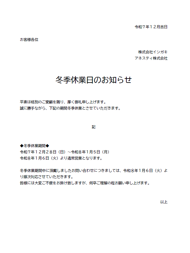 冬季休業日のお知らせ